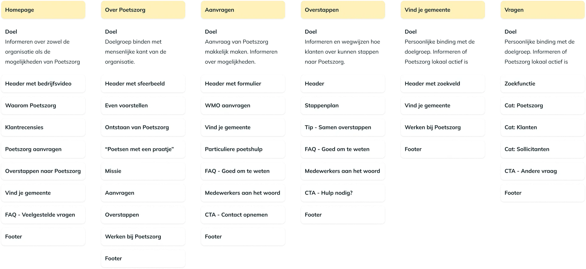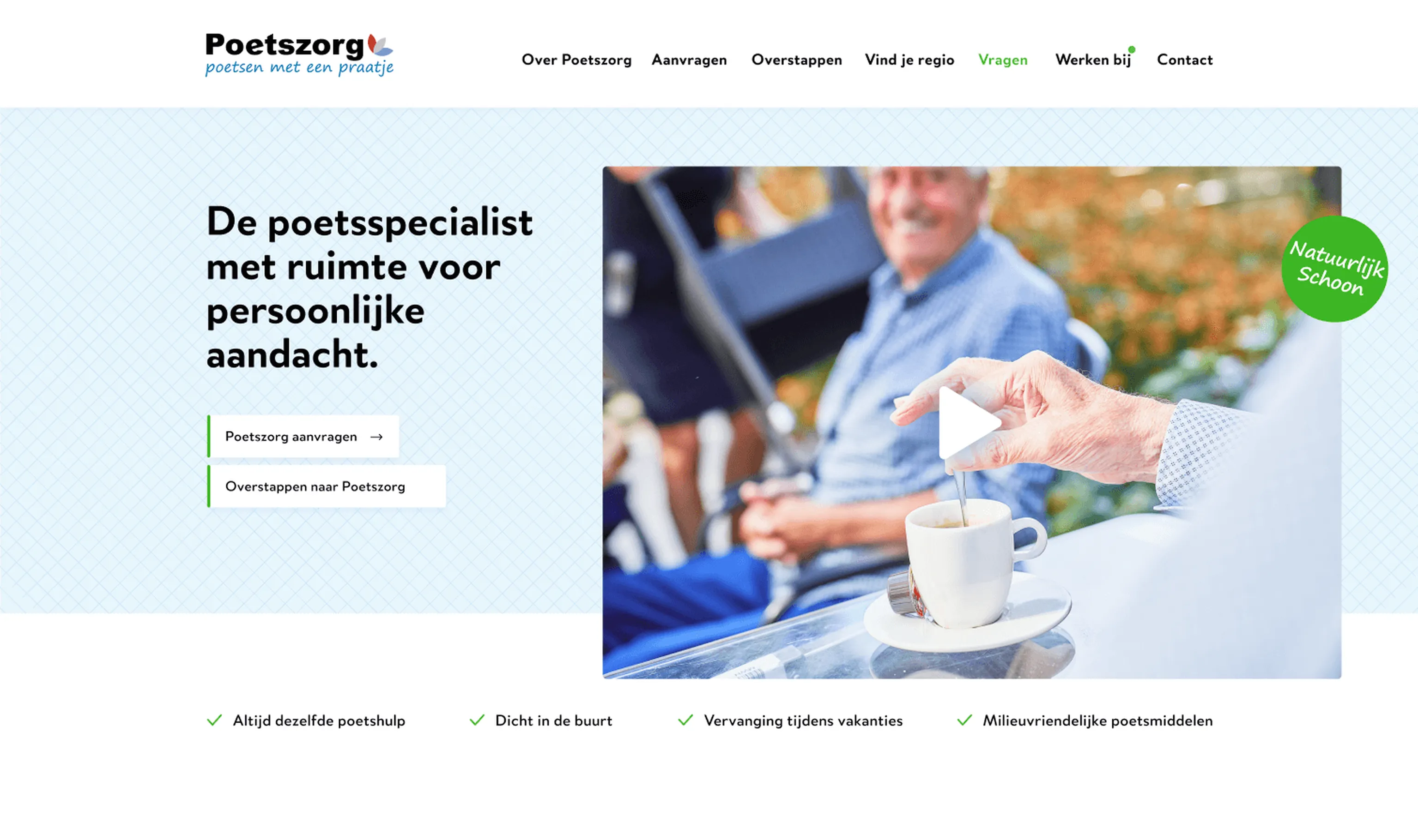 Poetszorg had een sterk verhaal, maar dat kwam online niet over. Het Poetsgevoel — warm, menselijk en dichtbij — ontbrak in hun uitstraling en website. Aan ons de taak om dit gevoel te vertalen naar een identiteit, website en online ervaring die vertrouwen wekt en nieuwe cliënten én medewerkers aanspreekt.